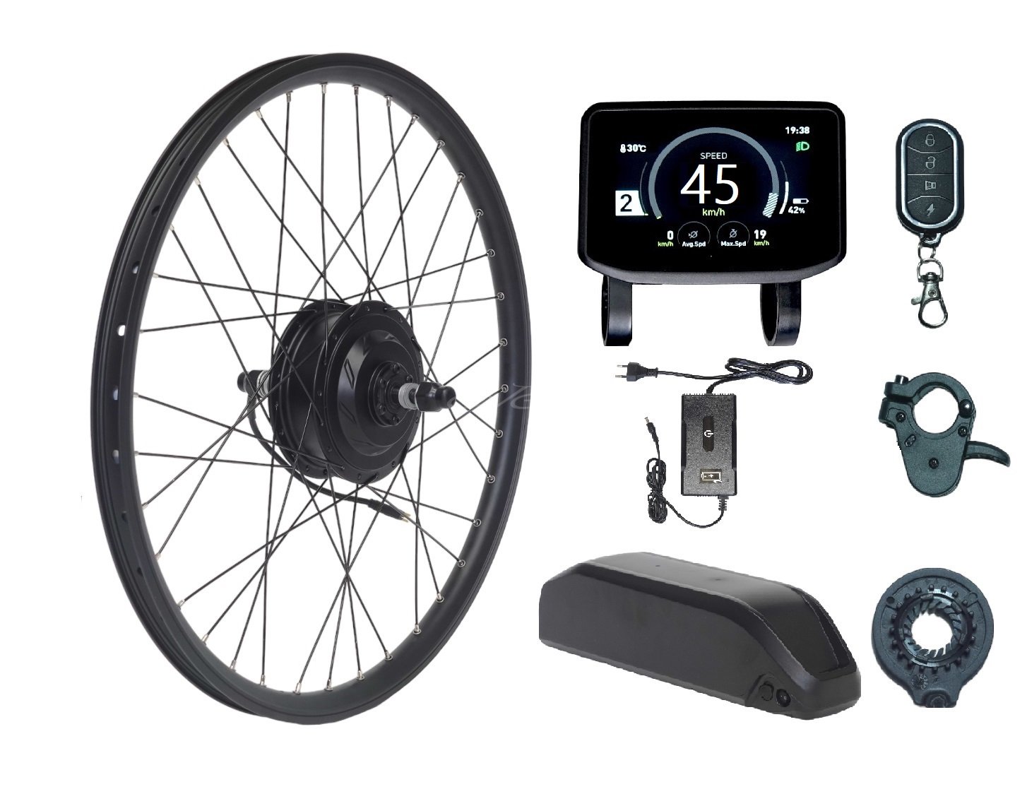 - контролер Garmata V2 30A з яскравим і функціональним дисплеєм Black Edition (з USB-портом 5v0,5A на тильній стороні для заряджання телефона), сигналізацією, ручкою газу та датчиком асистування педалей, пластиковим корпусом для кріплення на раму.