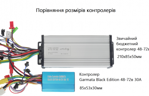 - контроллер-кит Garmata Black Edition V2 48-72v 65A (нова версія з яскравим кольоровим дисплеєм, синусним керуванням та коректною системою асистування педалям) з ручкою газу, датчиком PAS, сигналізацією та пластиковим боксом для кріплення на раму.